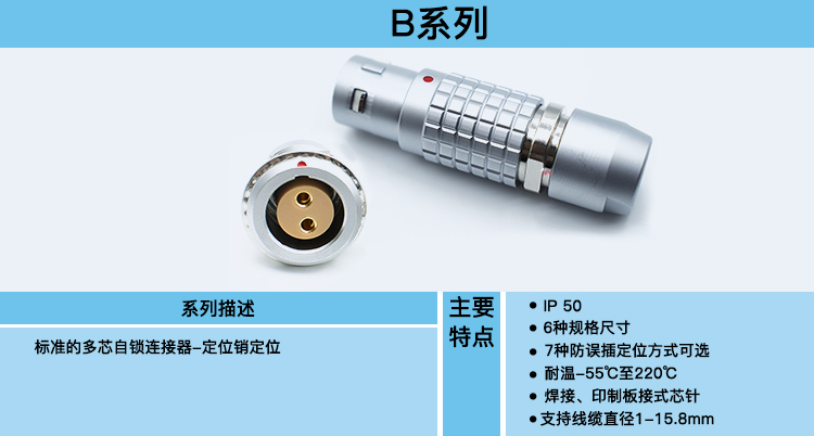 B系列是一款符合人体工程学要求、模块化的、坚固耐用并可靠的圆形连接器,用于需要快速安全插拔自锁的应用。该系列产品是试验、测量、检测仪表、医疗设备、科研和音频/视频应用的理想选择。