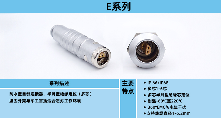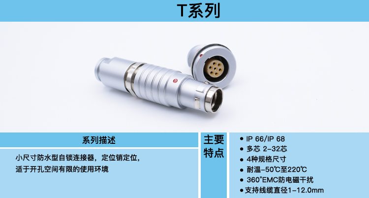T系列是一款防护等级达到(IP66 /68)的防水型小尺寸插拔自锁多芯连接器,可兼容B系列插座,是兼顾B系列开孔小的有点而研发的系列