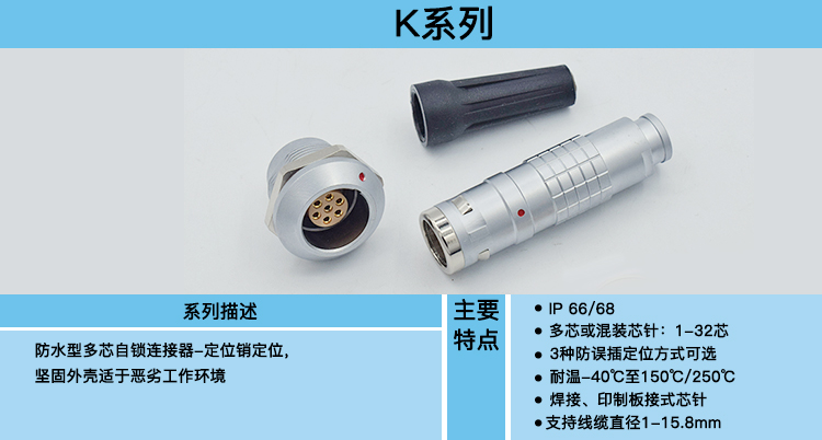 K系列防水型多芯自锁连接器(IP66 /68), 定位销定位, 坚固外壳适于恶劣工作环境