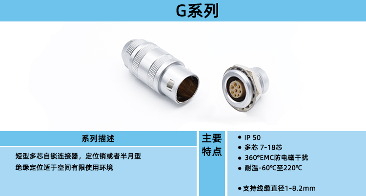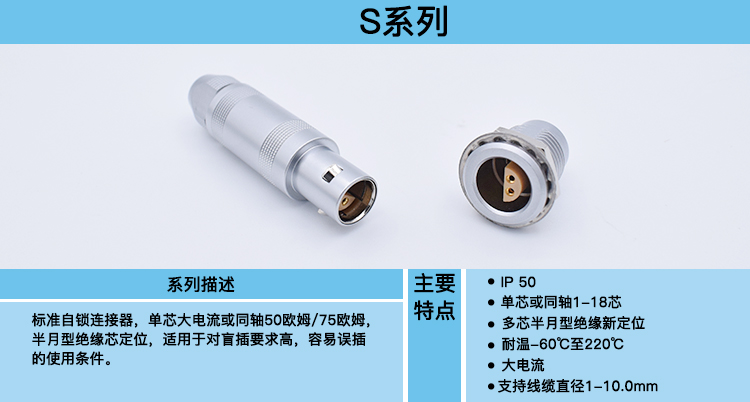 S系列标准自锁连接器, 半月型 绝缘芯定位 (多芯),实现无视野插拔应用.